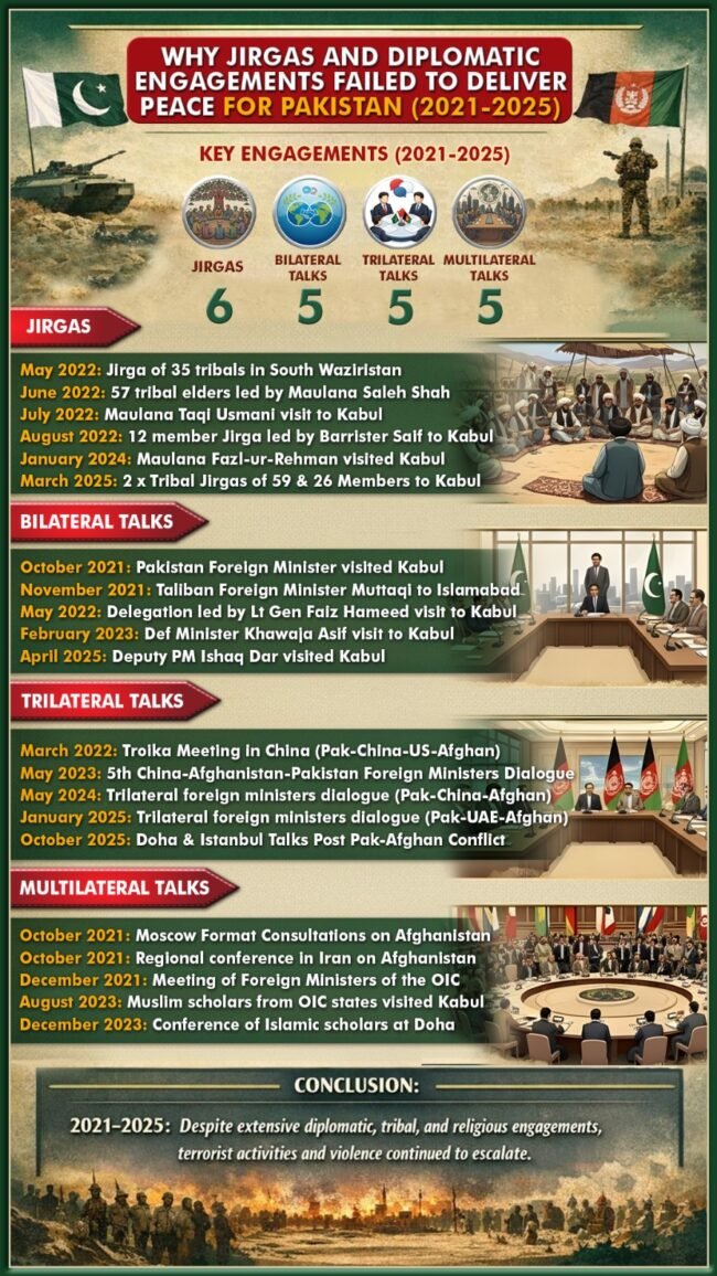 HomeInfographicsWhy Jirgas and Diplomatic Engagements Failed to Deliver Peace for Pakistan (2021-2025)April 14, 2026 5:40 am Facebook Twitter Pinterest WhatsApp Email Print